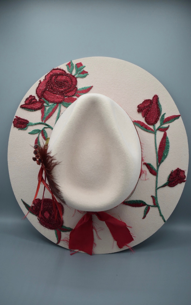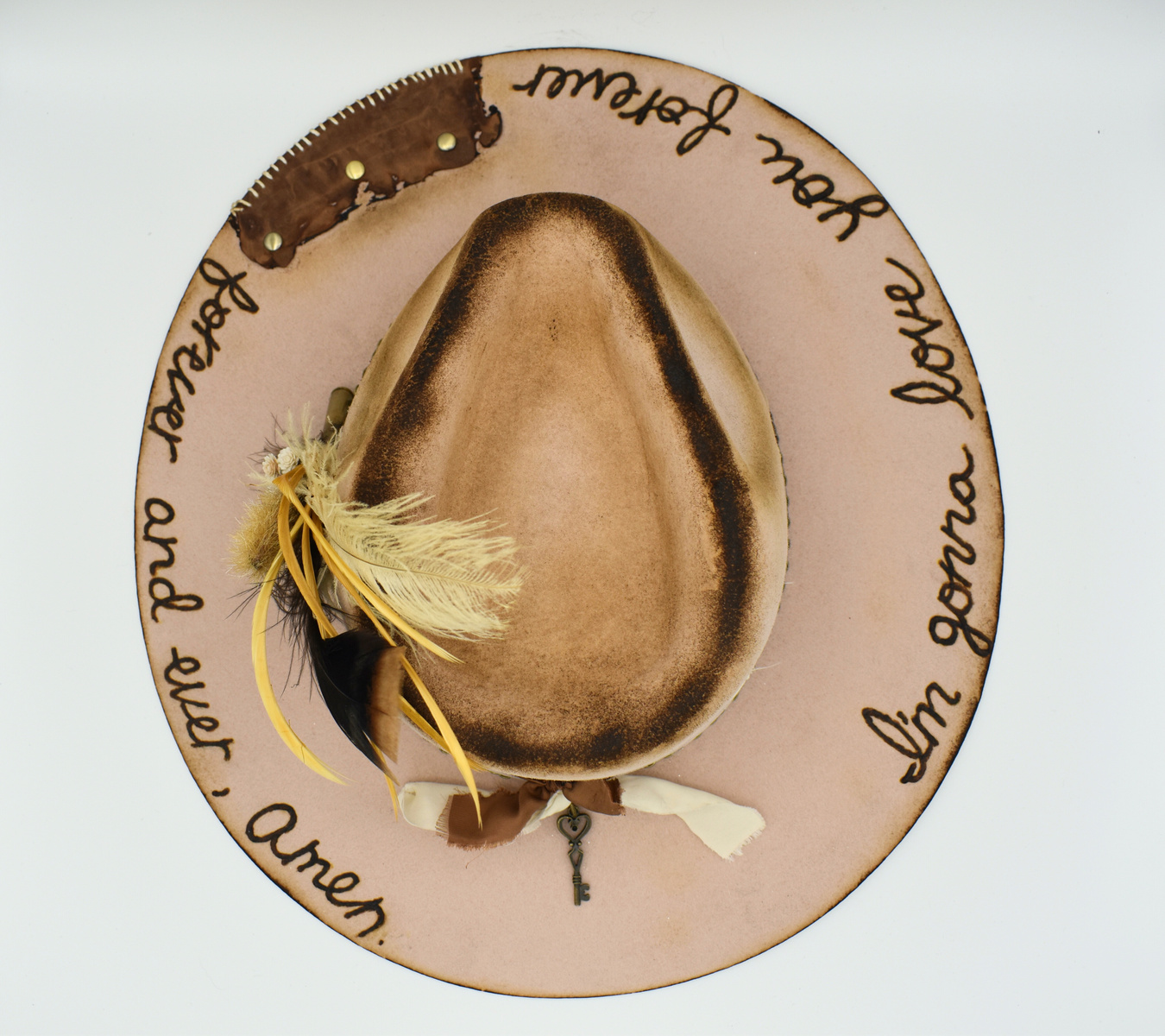 Stiff brim cowboy hat in 100% Australian wool. This hat has traditional cattleman style featuring a 3 part top crown crease and an upturned brim. Comes with custom picked raw edge fabric band, and Signature bullet with wisp or feather. Adjustable sizing, with velcro tab inside sweatband.
