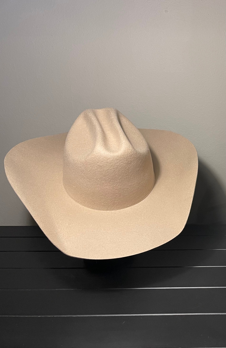 Stiff brim rancher hat in 100% Australian wool. Classic teardrop-shaped crown and versatile medium-length flat brim.