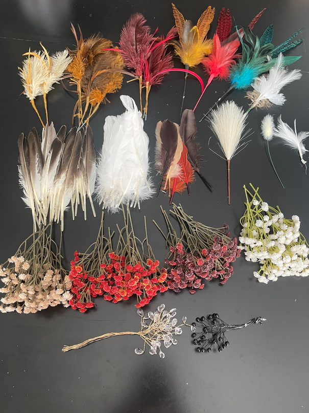 or a custom picked raw edged fabric band, and Signature bullet with wisp or feather.